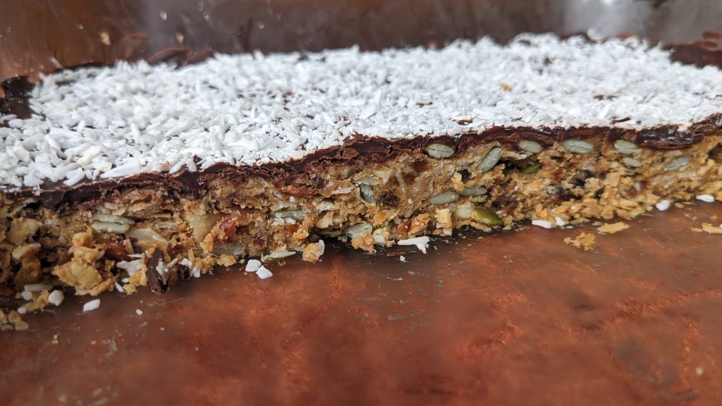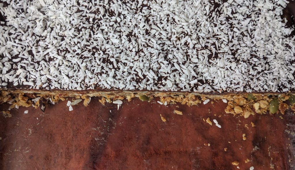 - À l’aide d’une spatile, étendre une fine couche de chocolat sur les barres et rapidement recouvrir de noix de coco râpée.